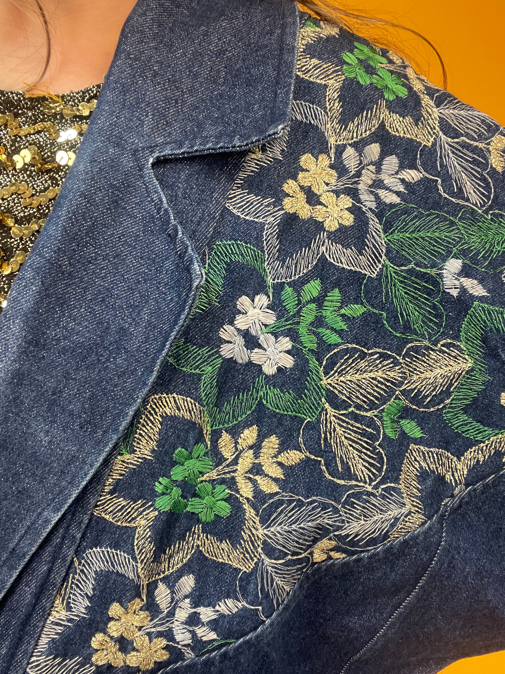 Dünne 80s Jeansjacke mit goldglänzender Blumenbestickung