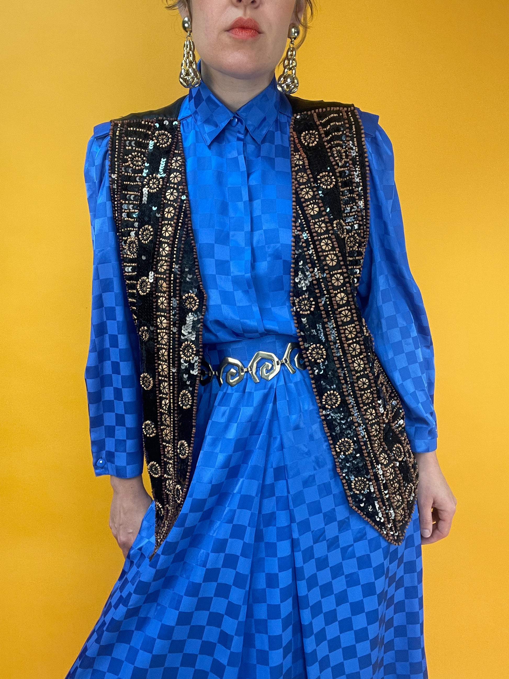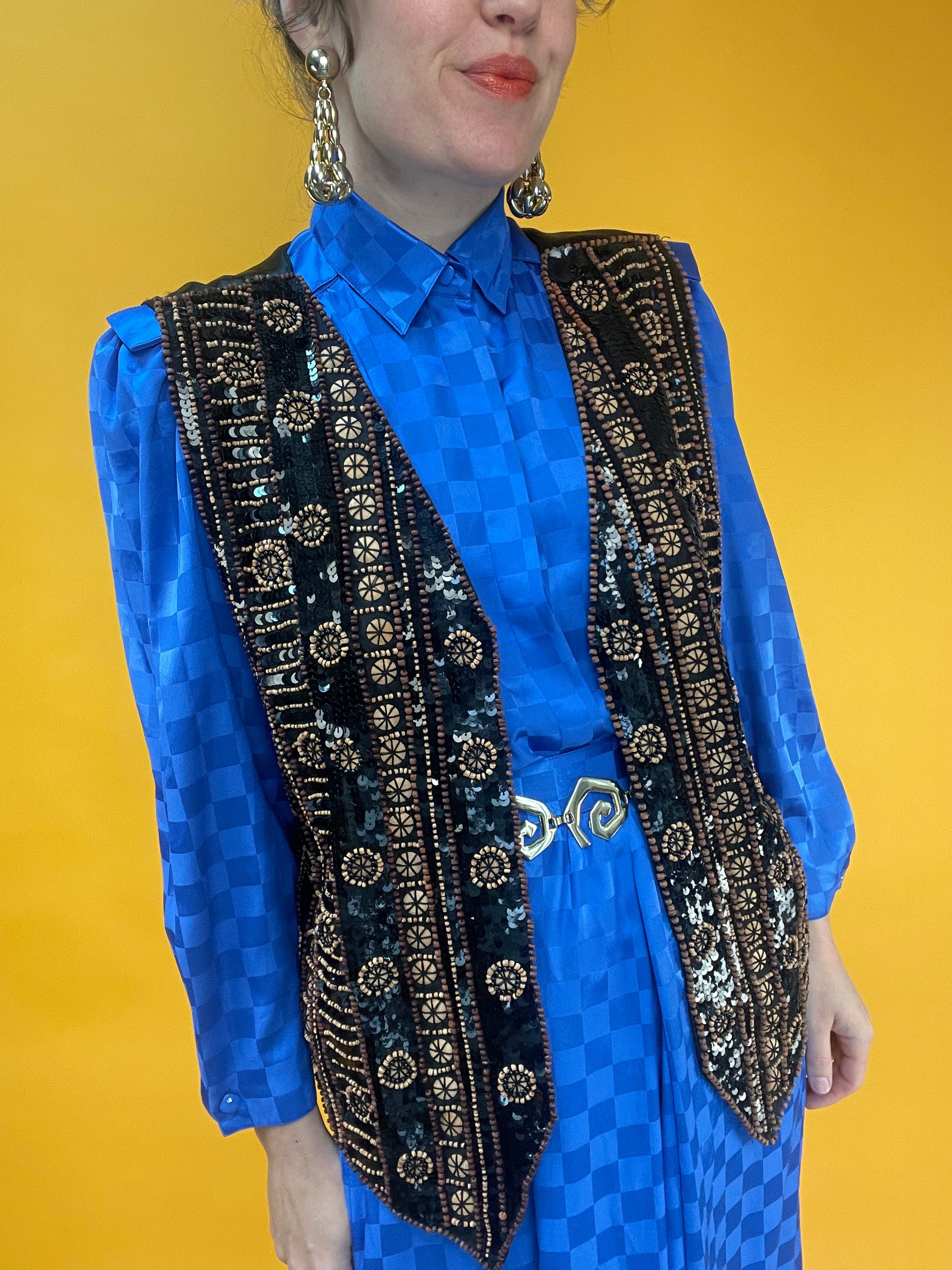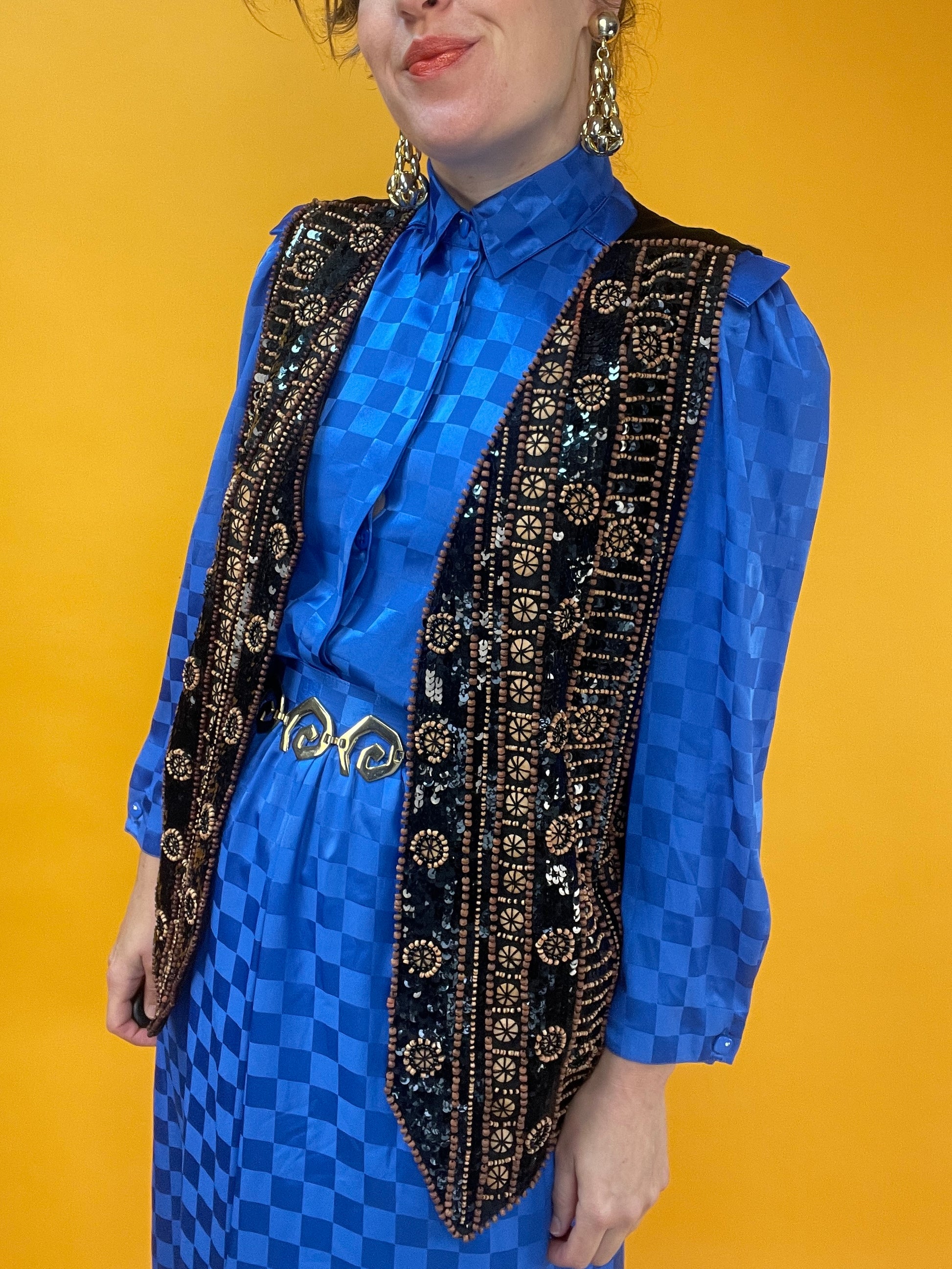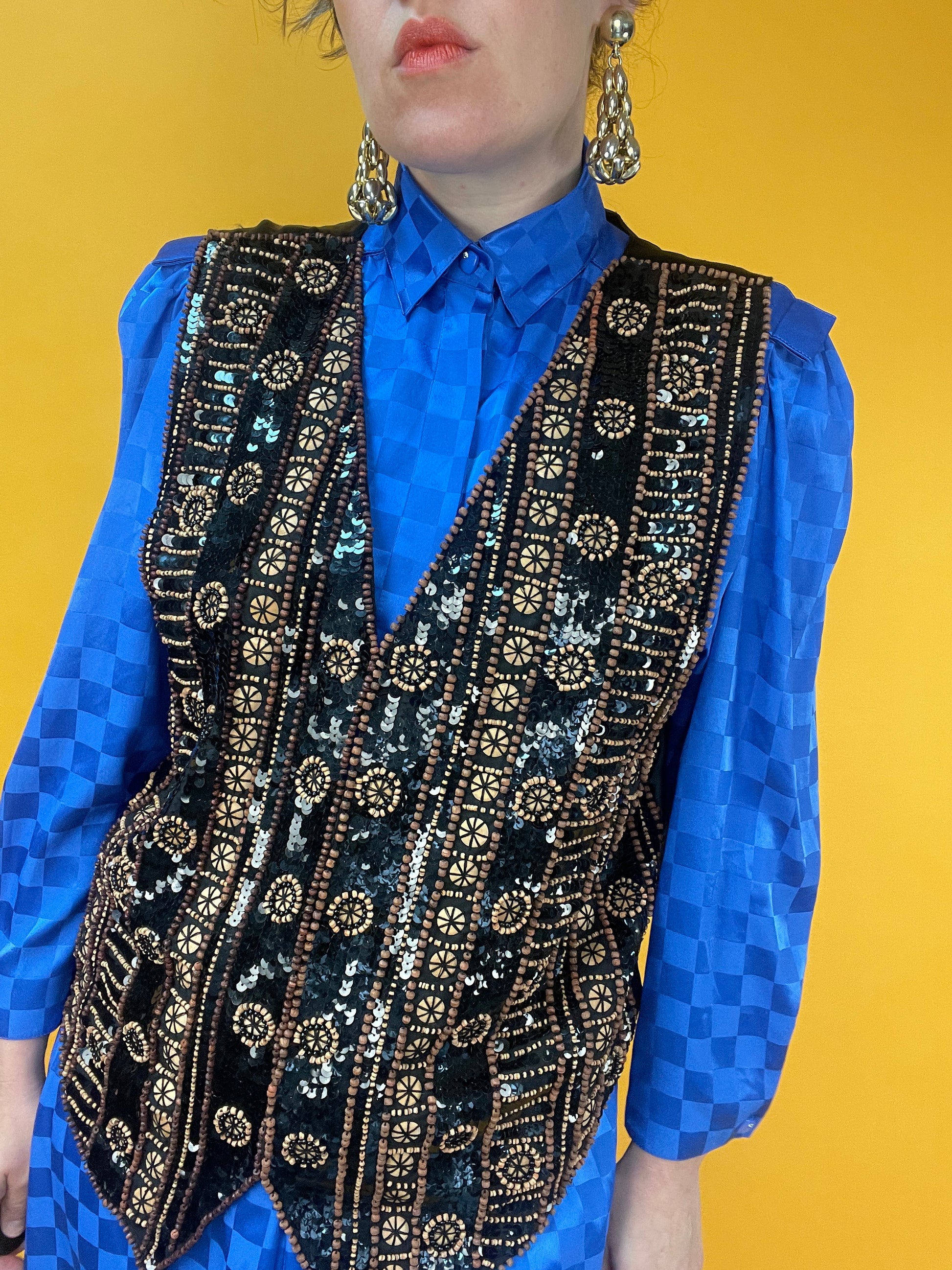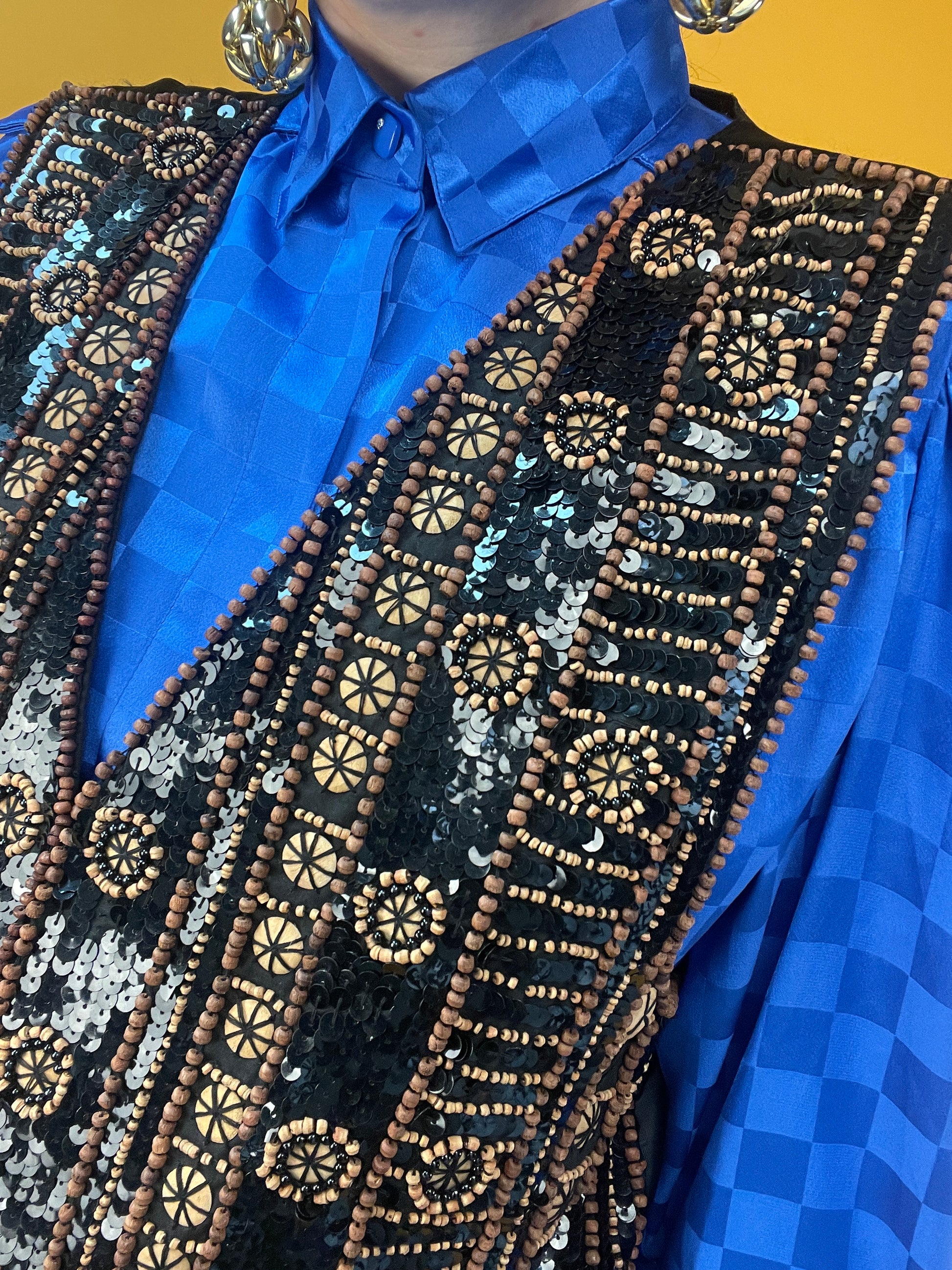 Ethno-Eleganza: Opulent bestickte Weste mit Holzperlen und Pailletten