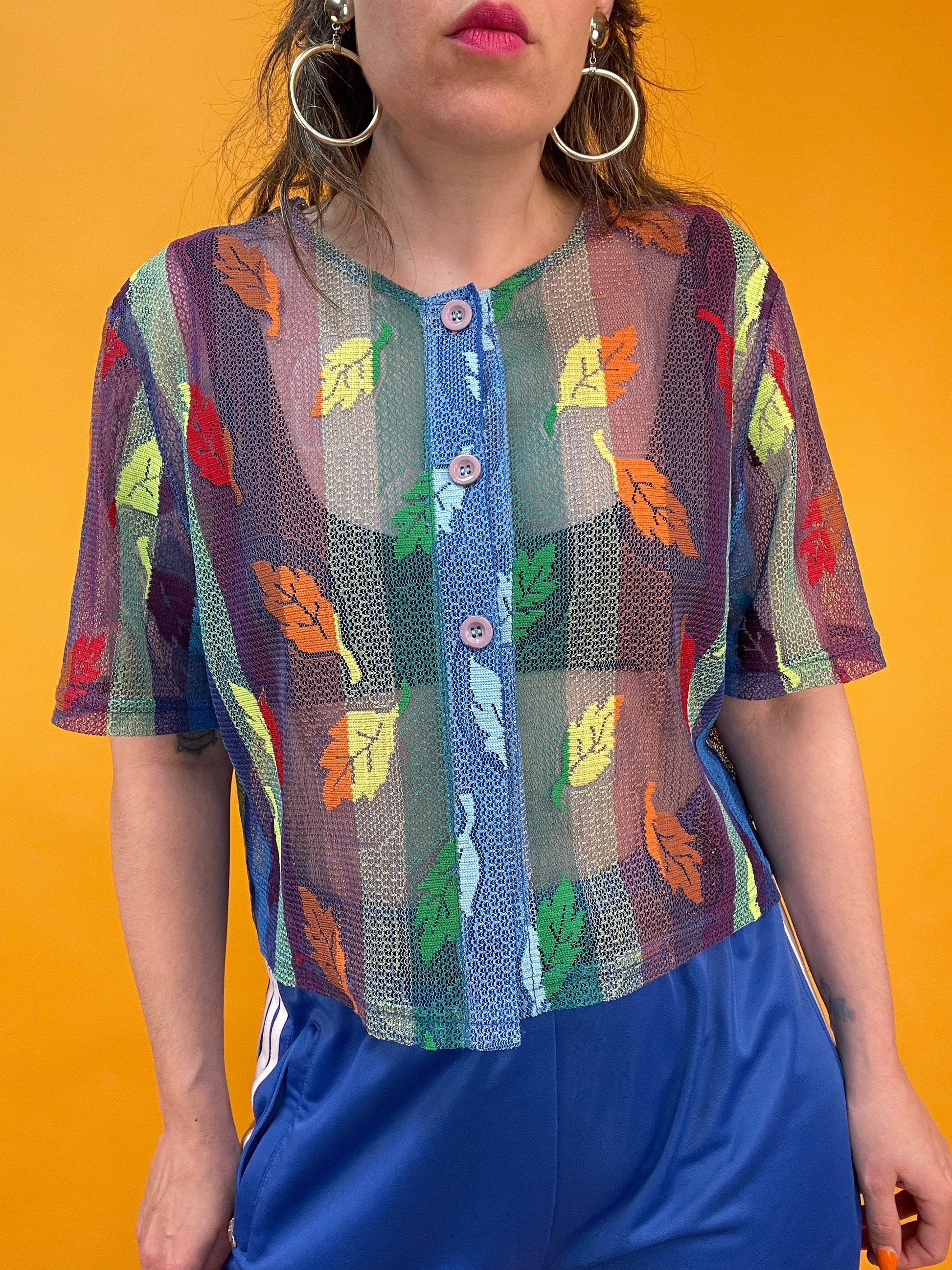 - Semitransparenter Stoff mit Neon-Regenbogen Streifenmuster und bunten Blättern